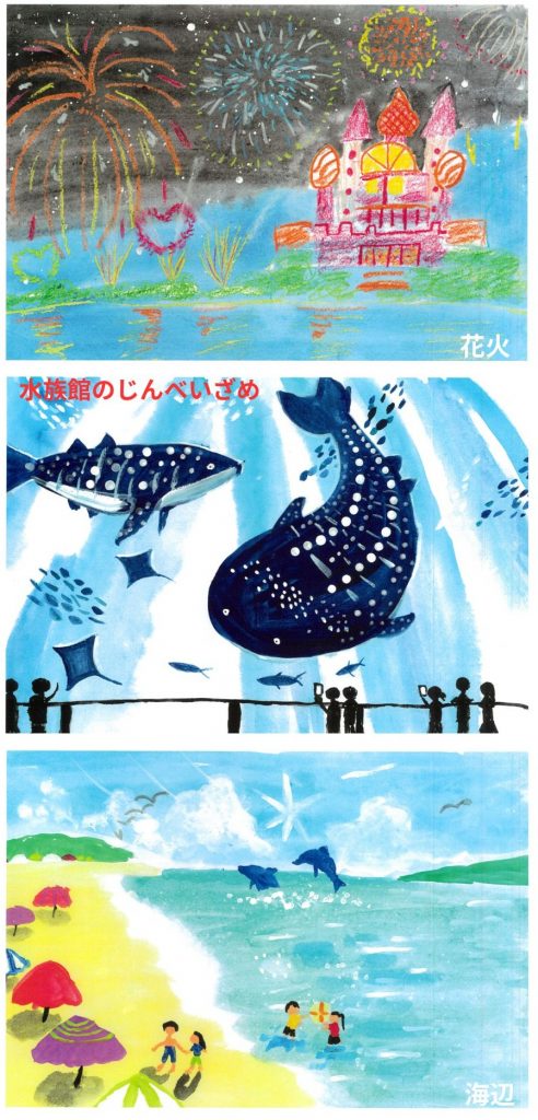 お城に形と花火の色あいがよくかけました。2 水族館のじんべいざめ 大きじんべいざめのもようがうまく描けました。3 海辺 海の透き通る色がきれいに出せました。パウソルで空と太陽が上手く書けました。