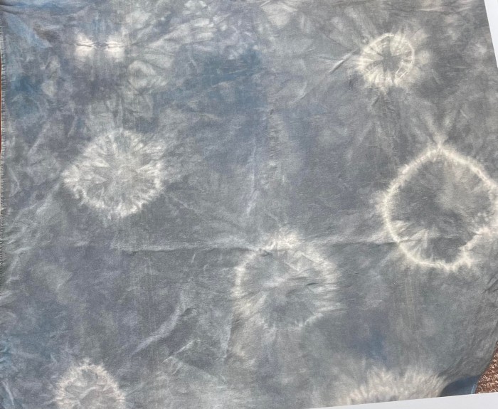 親子で藍染め体験に行きました。藍の葉を自分でハサミで切って模様を作るために割り箸やビー玉を使いました。