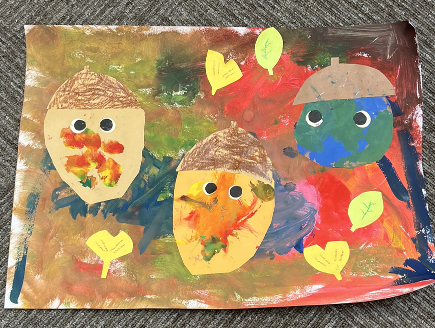 お兄ちゃんがどんぐりの形に切って3兄弟でどんぐりに色をつけました。