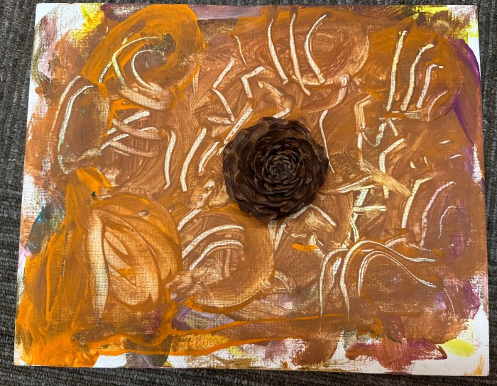 お砂場で見つけたまつぼっくりがバラのように見える!とのことで本人の気持ちのままに絵の具で作りました。