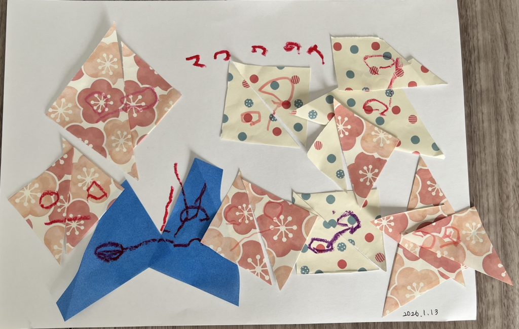 教室で三角のアプローチとしていただいた折り紙を元に、蝶やお星様や家族を切り紙で表現していました。とても集中して取り組んでいました!
