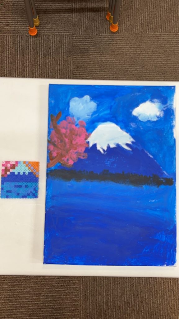 富士山の絵(絵の具)とそれを見て作ったアイロンビーズです。