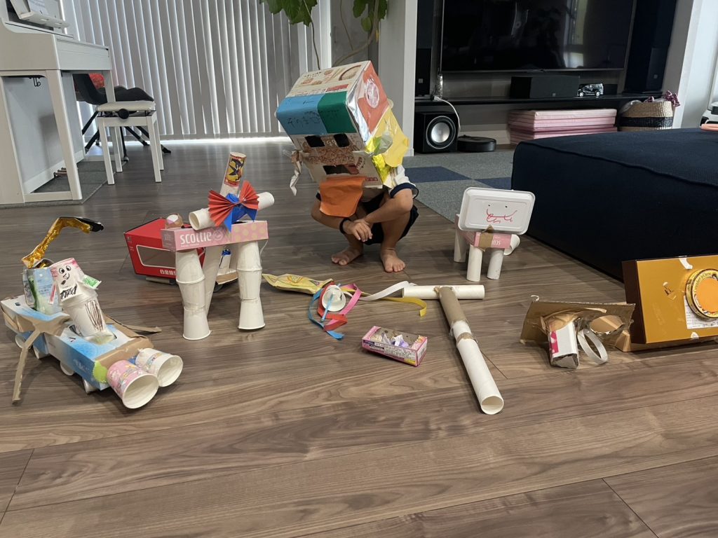 空箱を見つけるとすぐに工作に集中しています。出来上がった作品をみると子供の世界観がのぞけて楽しいです。